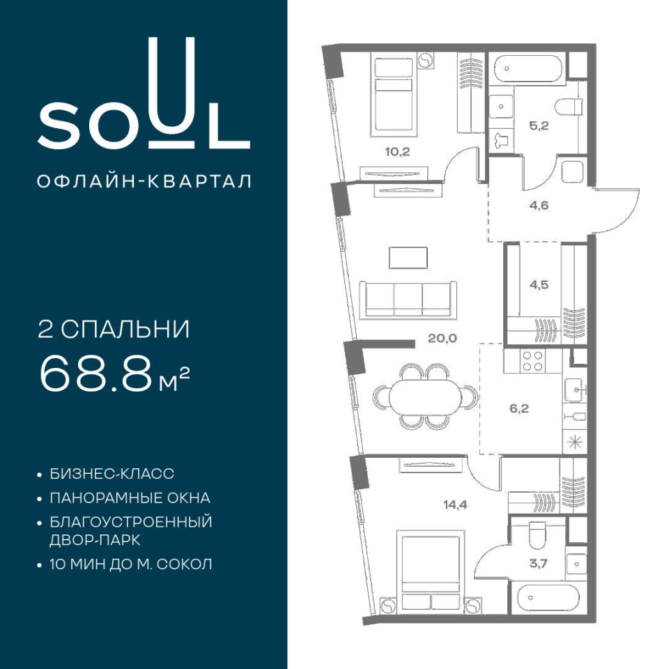 Цены указаны с условием 100% оплаты и стандартной ипотеки. Прямая продажа от застройщика. Продается 2-к. квартира номер 819 общей площадью 68.8 кв.м. на 20-м этаже 24 этажного дома, Корпус 9. С отделкой White Box Max. Проект бизнес-класса SOUL от девелопера FORMA. До метро Сокол 10 мин пешком. Архитектура от британского бюро SimpsonHaugh. Благоустройство дворов — Gillespies и GAFA. Территория состоит из культурного парка и приватных дворов. Озеленение в эстетике лесного оазиса. Насыщенное благоустройство: прогулочные тропинки, релакс-зоны, пряный и сенсорный сады, развивающие детские площадки и воркауты. В центре проекта объект культурного наследия — общественное пространство Изофабрика, построенная в 30-х годах по проекту архитектора Георгия Гольца. Здесь будут располагаться мастерские для взрослых и детей, выставочные залы, коворкинги, образовательный центр, рестораны и кафе. Квартиры с панорамными окнами, мастер-спальнями, гардеробными, классическими балконами и лоджиями, видовыми террасами. Высота потолков от 2,9 до 3,5 м. В проекте 2 детских сада на 100 и 200 малышей. Клубная гостиная, фитнес-рум, детская игровая комната, дизайнерские лобби, подземный паркинг и келлеры.