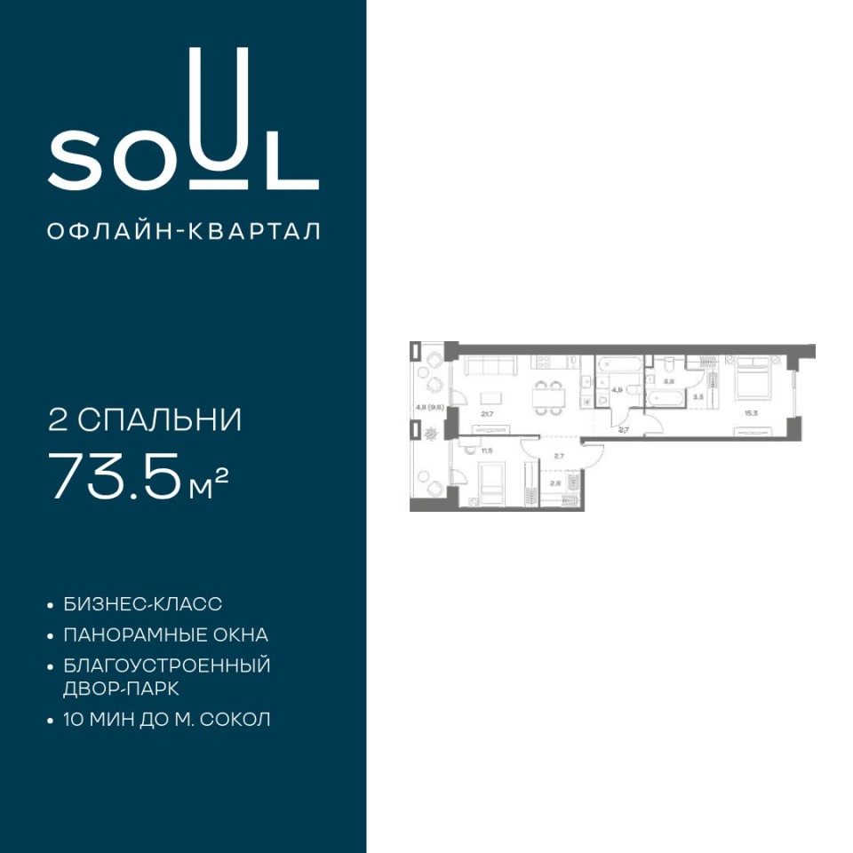 Цены указаны с условием 100% оплаты и стандартной ипотеки. Прямая продажа от застройщика. Продается 2-к. квартира номер 265 общей площадью 73.5 кв.м. на 5-м этаже 8 этажного дома, корпус UNIQUE (премиум-класс). Без отделки. Проект бизнес-класса SOUL от девелопера FORMA. До метро Сокол 10 мин пешком. Архитектура от британского бюро SimpsonHaugh. Благоустройство дворов — Gillespies и GAFA. Территория состоит из культурного парка и приватных дворов. Озеленение в эстетике лесного оазиса. Насыщенное благоустройство: прогулочные тропинки, релакс-зоны, пряный и сенсорный сады, развивающие детские площадки и воркауты. В центре проекта объект культурного наследия — общественное пространство Изофабрика, построенная в 30-х годах по проекту архитектора Георгия Гольца. Здесь будут располагаться мастерские для взрослых и детей, выставочные залы, коворкинги, образовательный центр, рестораны и кафе. Квартиры с панорамными окнами, мастер-спальнями, гардеробными, классическими балконами и лоджиями, видовыми террасами. Высота потолков от 2,9 до 3,5 м. В проекте 2 детских сада на 100 и 200 малышей. Клубная гостиная, фитнес-рум, детская игровая комната, дизайнерские лобби, подземный паркинг и келлеры.