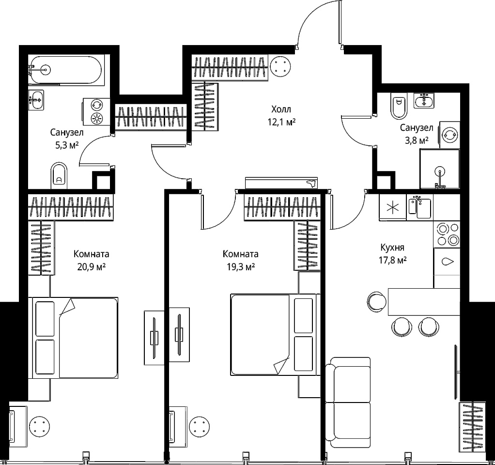 | Жилая площадь | 40.2 м2 | Площадь комнат | 19.3 + 20.9 м2 |