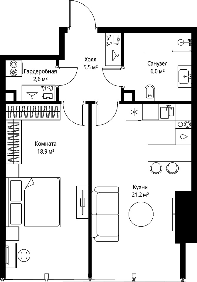 | Жилая площадь | 18.9 м2 | Площадь комнат | 18.9 м2 |