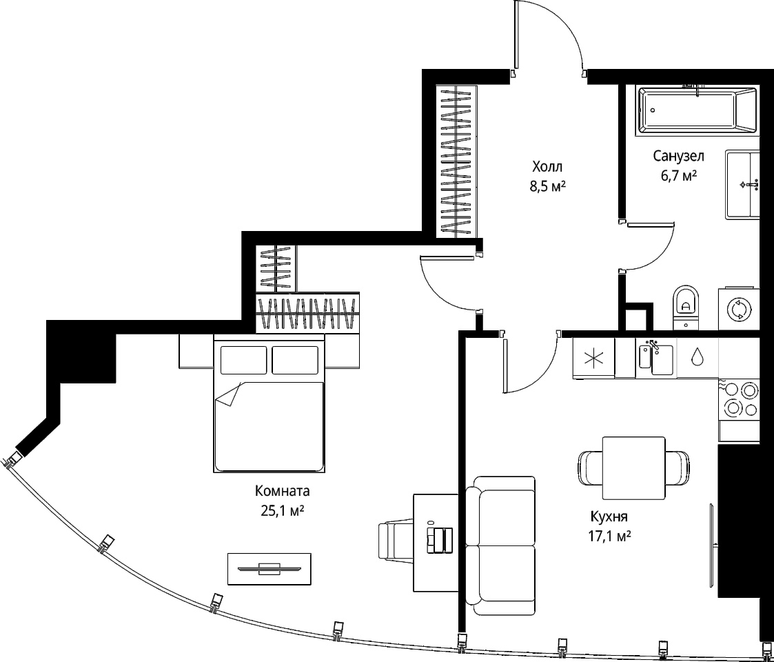 | Жилая площадь | 25.1 м2 | Площадь комнат | 25.1 м2 |