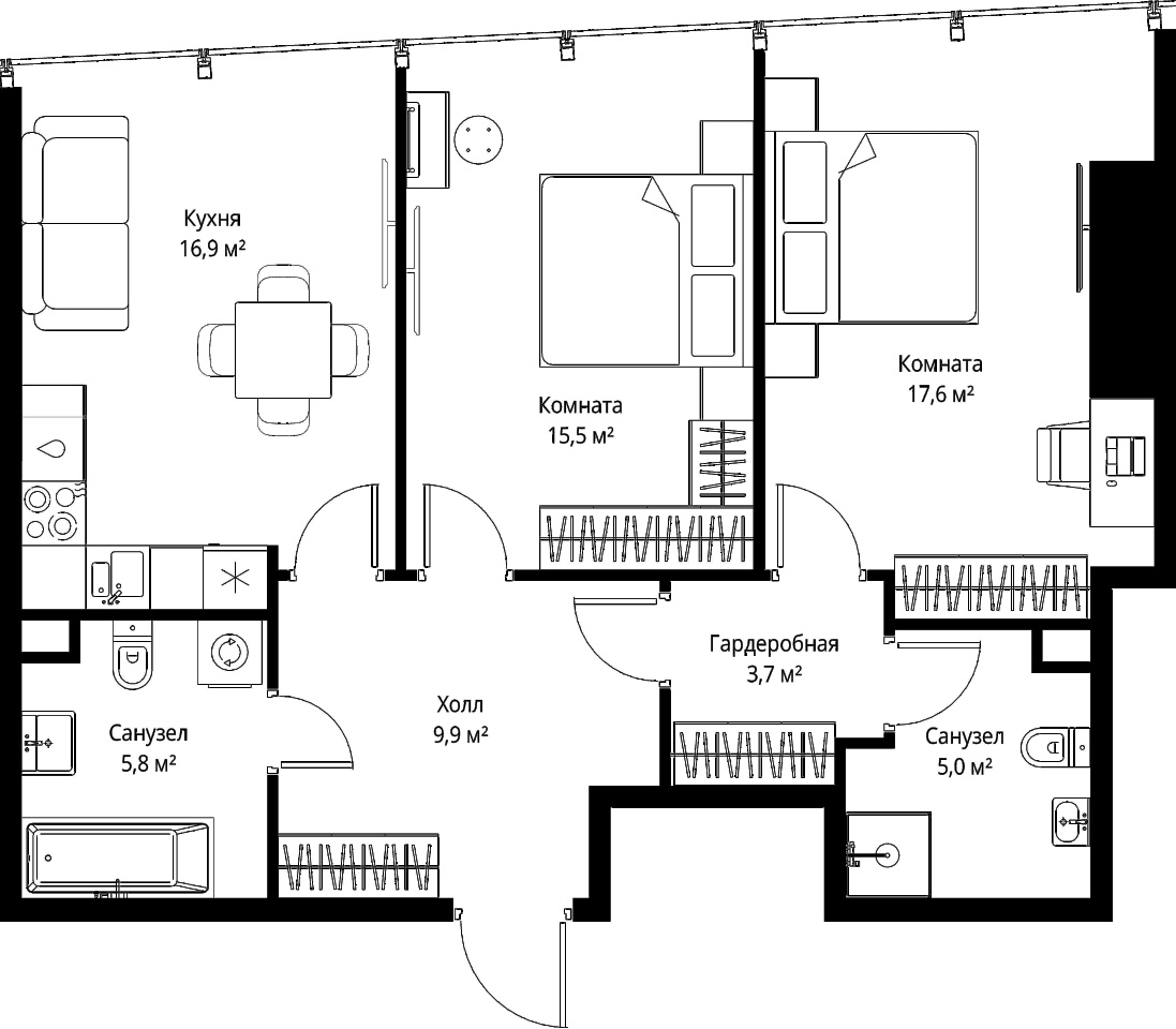 | Жилая площадь | 33.1 м2 | Площадь комнат | 17.6 + 15.5 м2 |