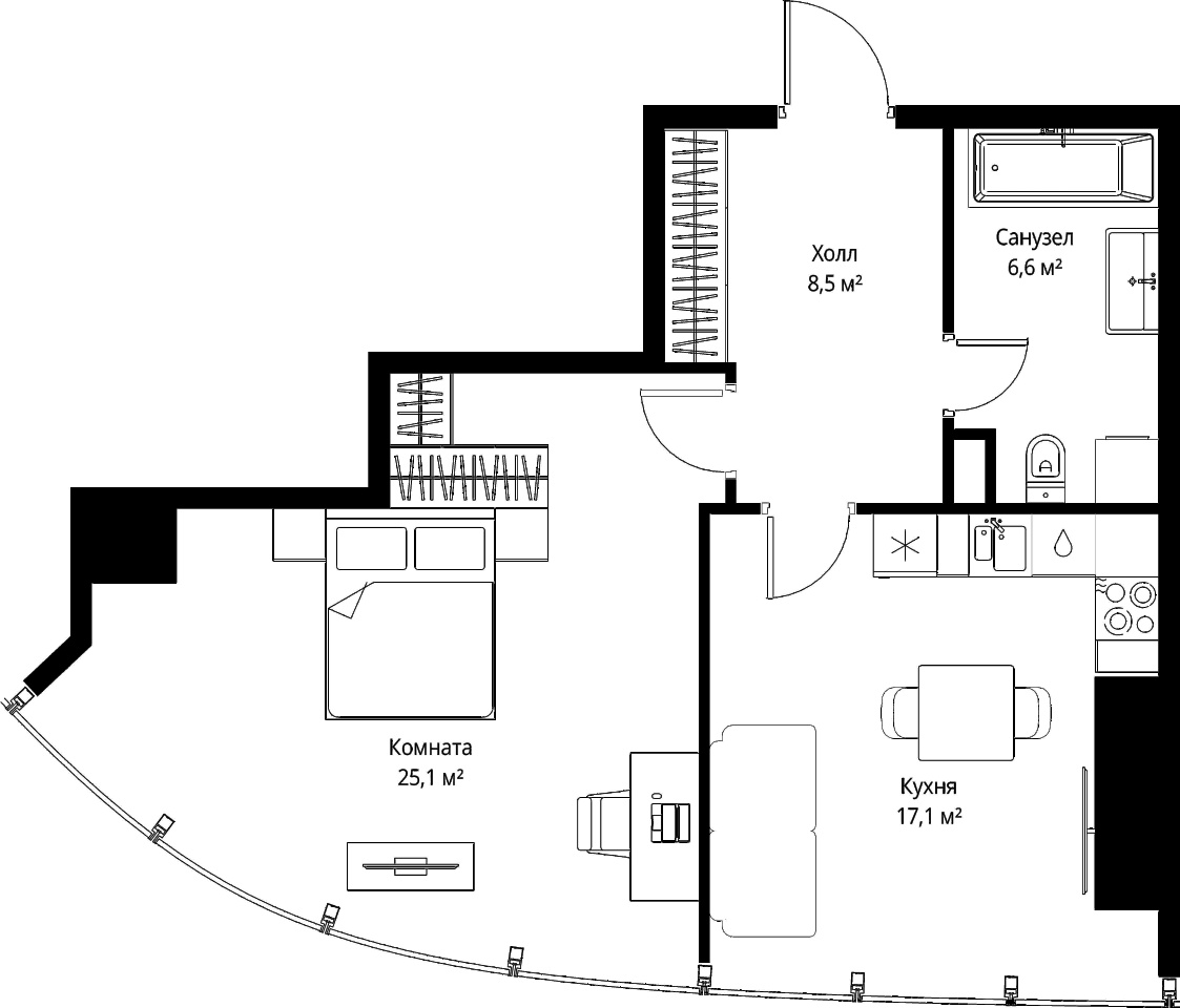 | Жилая площадь | 25.1 м2 | Площадь комнат | 25.1 м2 |