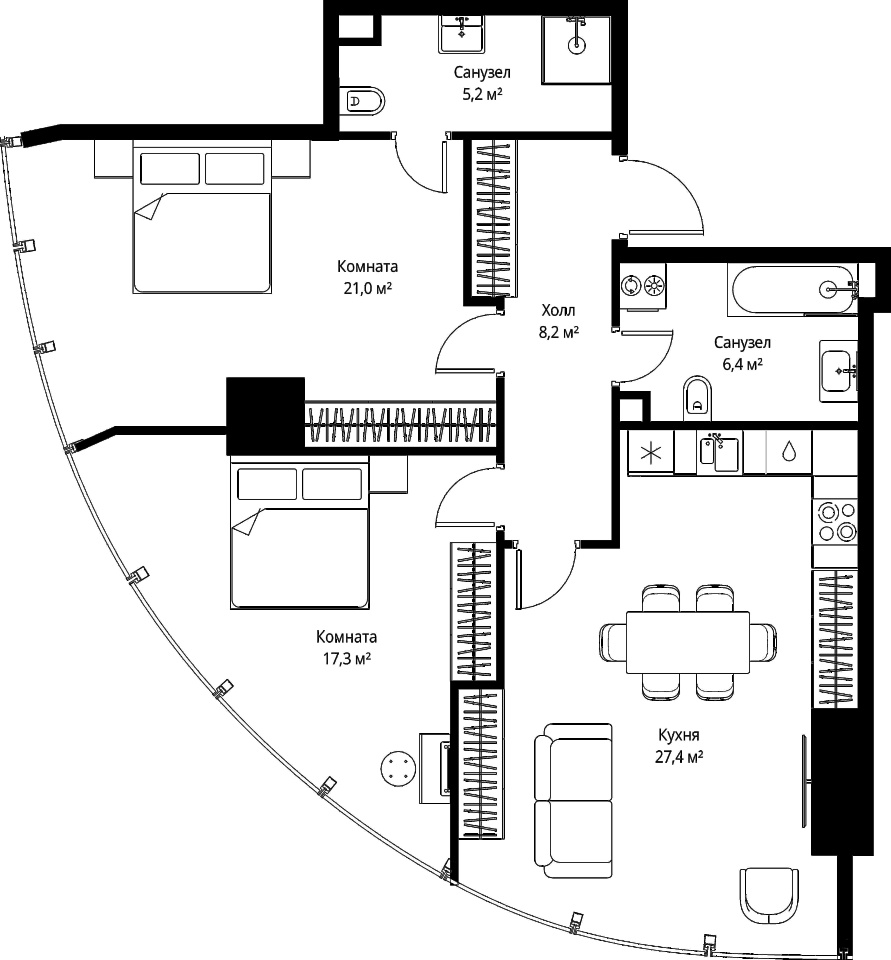 | Этаж | 55 из 90 | Площадь кухни | 27.4 м2 |
