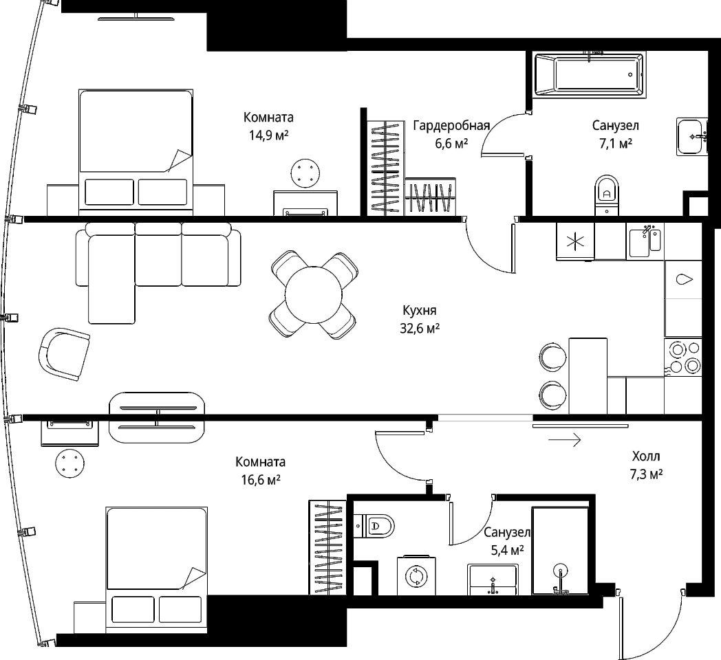 | Жилая площадь | 31.5 м2 | Площадь комнат | 16.6 + 14.9 м2 |