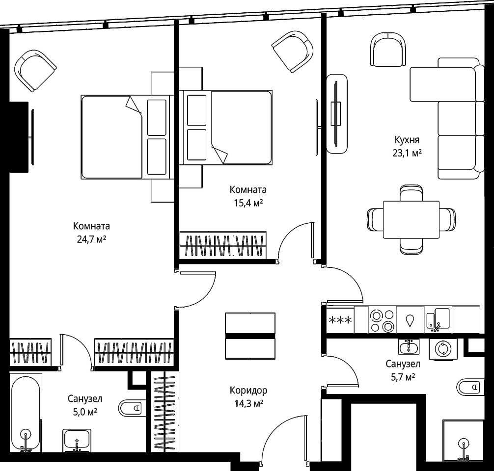 | Жилая площадь | 40.1 м2 | Площадь комнат | 15.4 + 24.7 м2 |