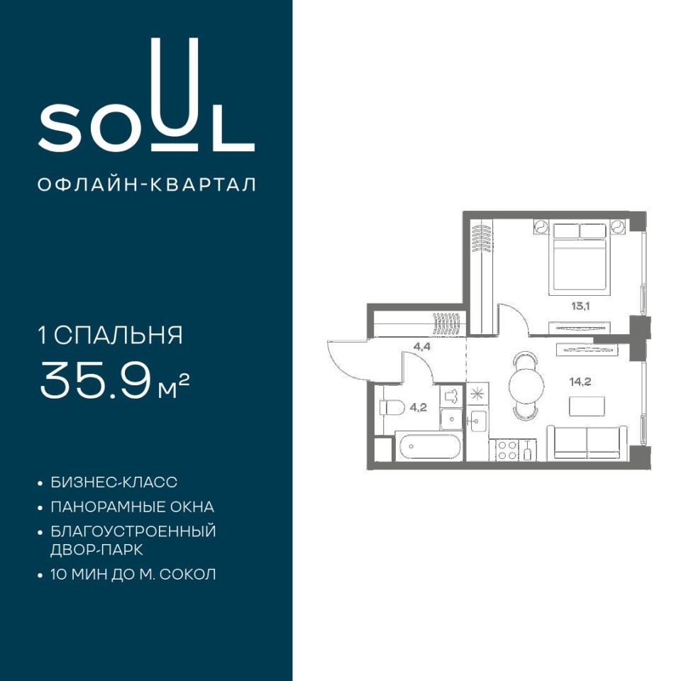 Цены указаны с условием 100% оплаты и стандартной ипотеки. Прямая продажа от застройщика. Продается 1-к. квартира номер 562 общей площадью 35.9 кв.м. на 2-м этаже 24 этажного дома, Корпус 9. С предчистовой отделкой. Проект бизнес-класса СОУЛ от девелопера FORMA. До метро Сокол 10 мин пешком. Архитектура от британского бюро SimpsonHaugh. Благоустройство дворов — Gillespies и GAFA. Территория состоит из культурного парка и приватных дворов. Озеленение в эстетике лесного оазиса. Насыщенное благоустройство: прогулочные тропинки, релакс-зоны, пряный и сенсорный сады, развивающие детские площадки и воркауты. В центре проекта объект культурного наследия — общественное пространство Изофабрика, построенная в 30-х годах по проекту архитектора Георгия Гольца. Здесь будут располагаться мастерские для взрослых и детей, выставочные залы, коворкинги, образовательный центр, рестораны и кафе. Квартиры с панорамными окнами, мастер-спальнями, гардеробными, классическими балконами и лоджиями, видовыми террасами. Высота потолков от 2,9 до 3,5 м. В проекте 2 детских сада на 100 и 200 малышей. Клубная гостиная, фитнес-комната, детская игровая комната, дизайнерские лобби, подземный паркинг и кладовые.