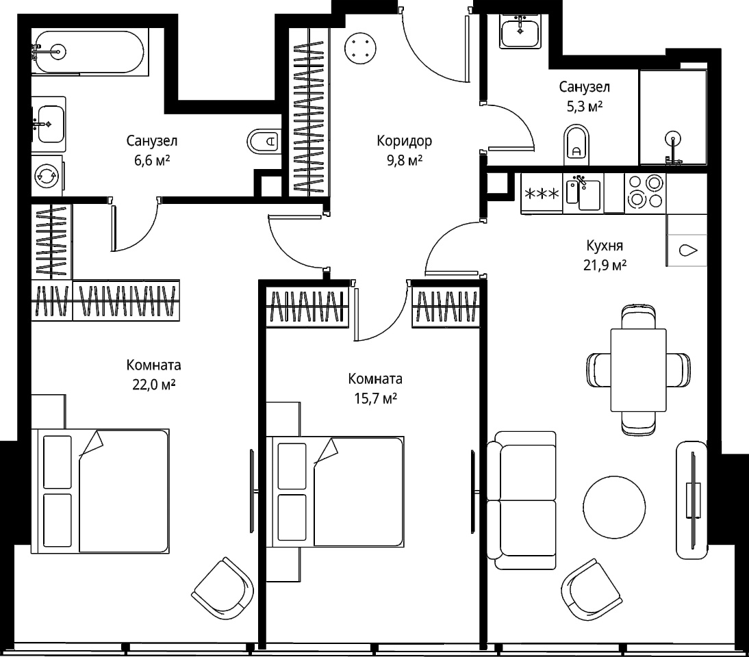 | Жилая площадь | 37.7 м2 | Площадь комнат | 15.7 + 22 м2 |
