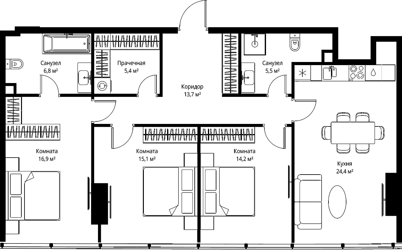 | Жилая площадь | 46.2 м2 | Площадь комнат | 15.1 + 14.2 + 16.9 м2 |
