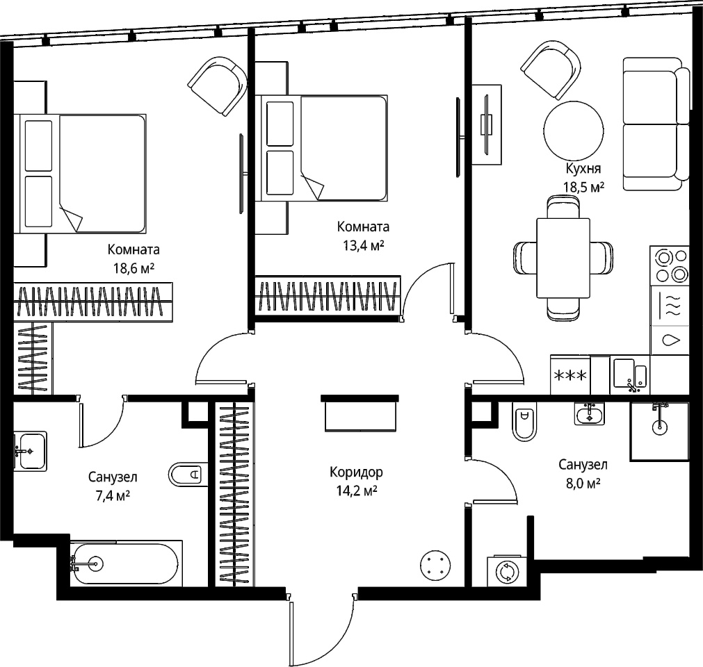 | Жилая площадь | 32 м2 | Площадь комнат | 18.6 + 13.4 м2 |