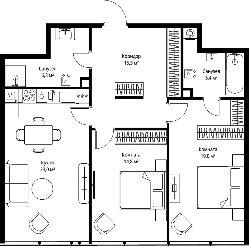 Жилая площадь 33.8 м2 Площадь комнат 19 + 14.8 м2