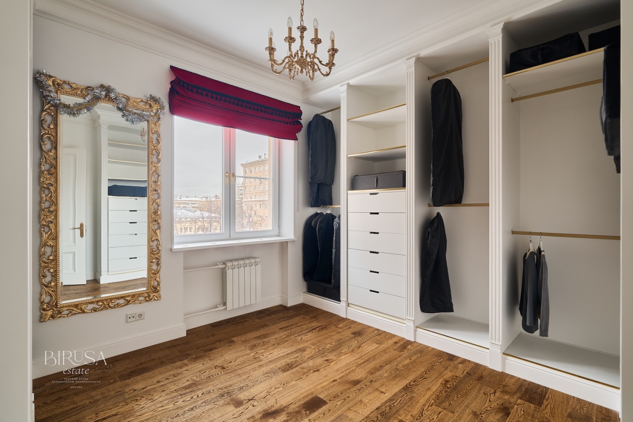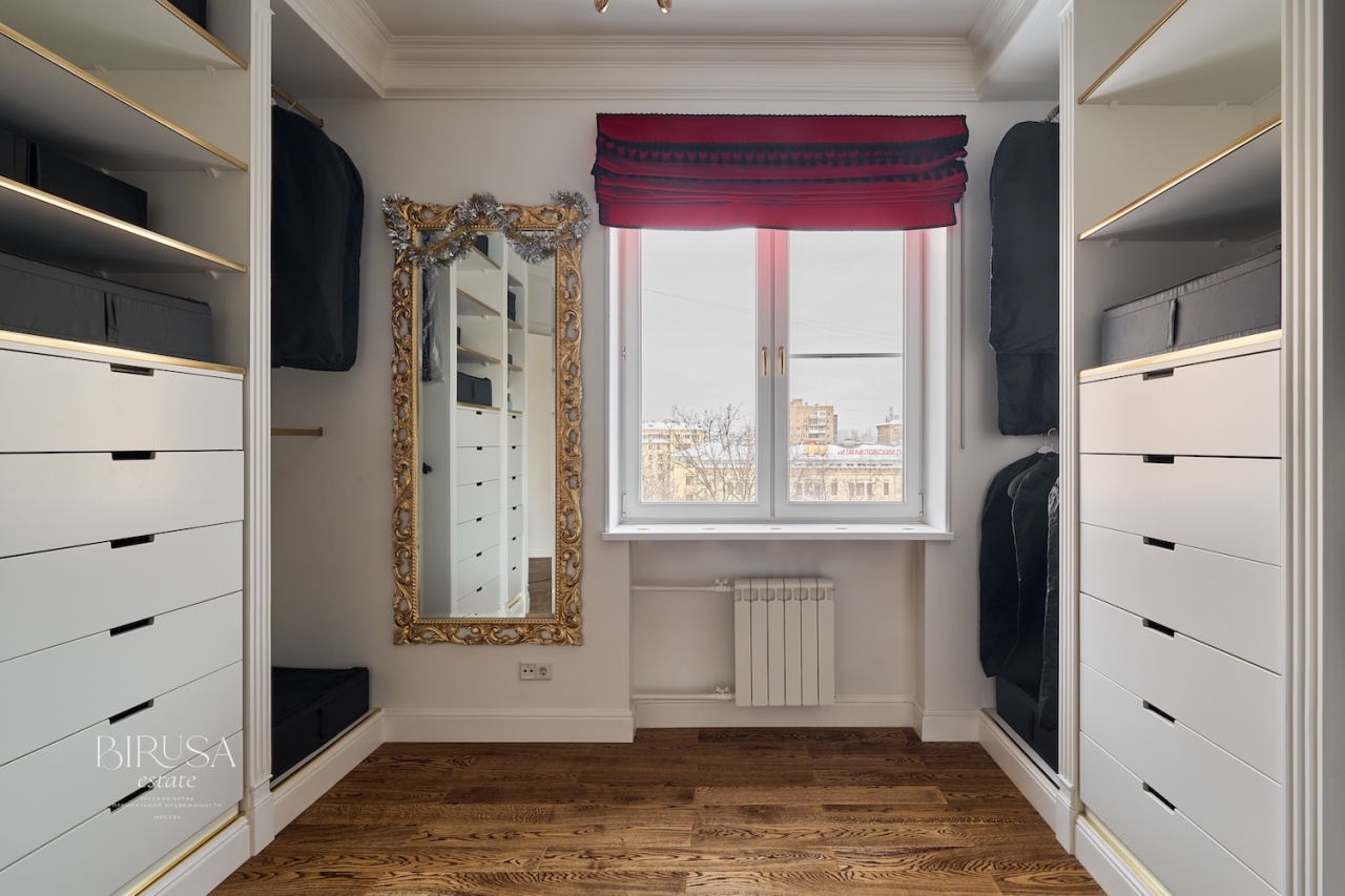 — просторная гардеробная с окном — редкое решение для сталинских домов;