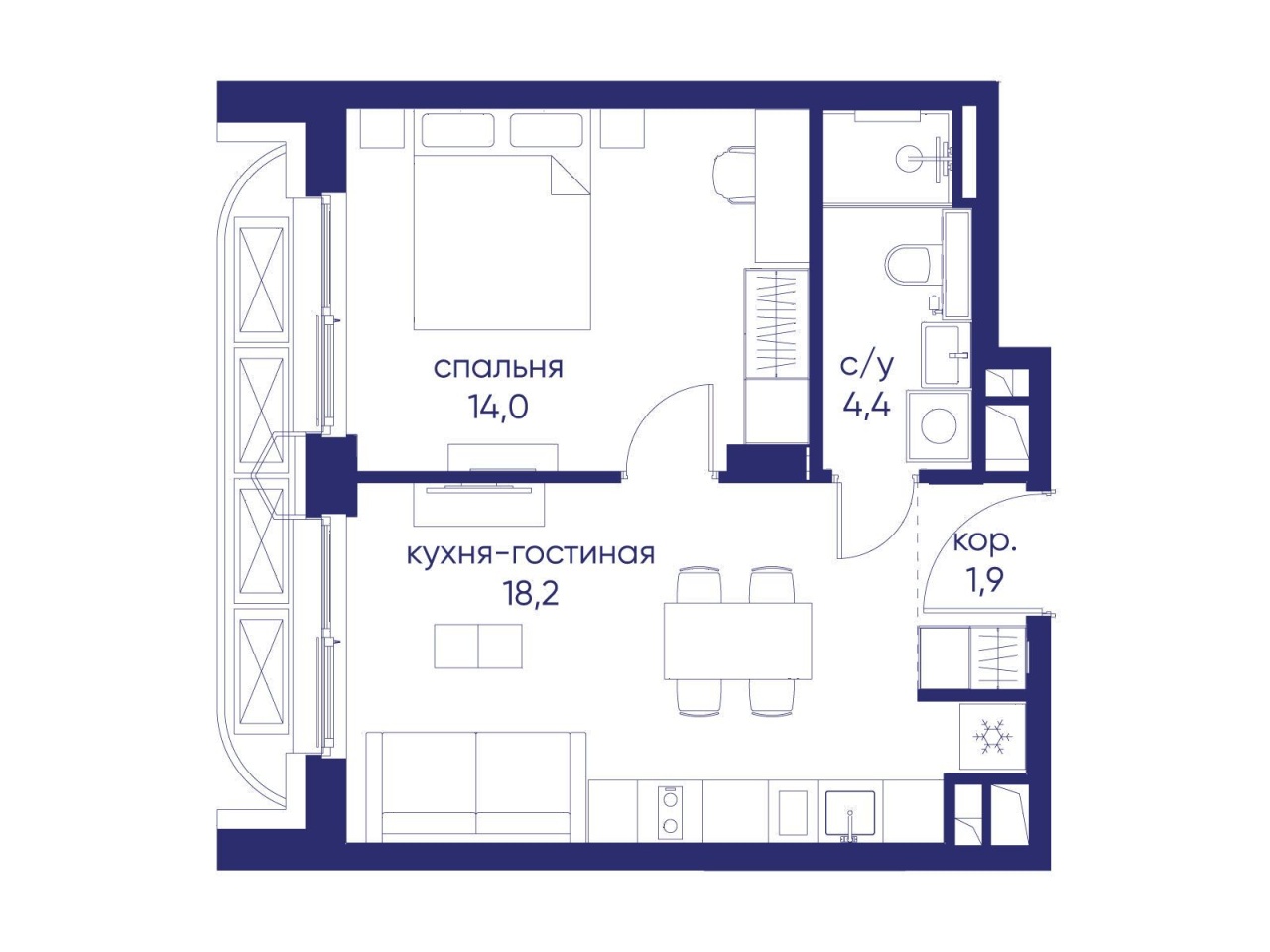 | Жилая площадь | 14 м2 | Площадь комнат | 14 м2 |