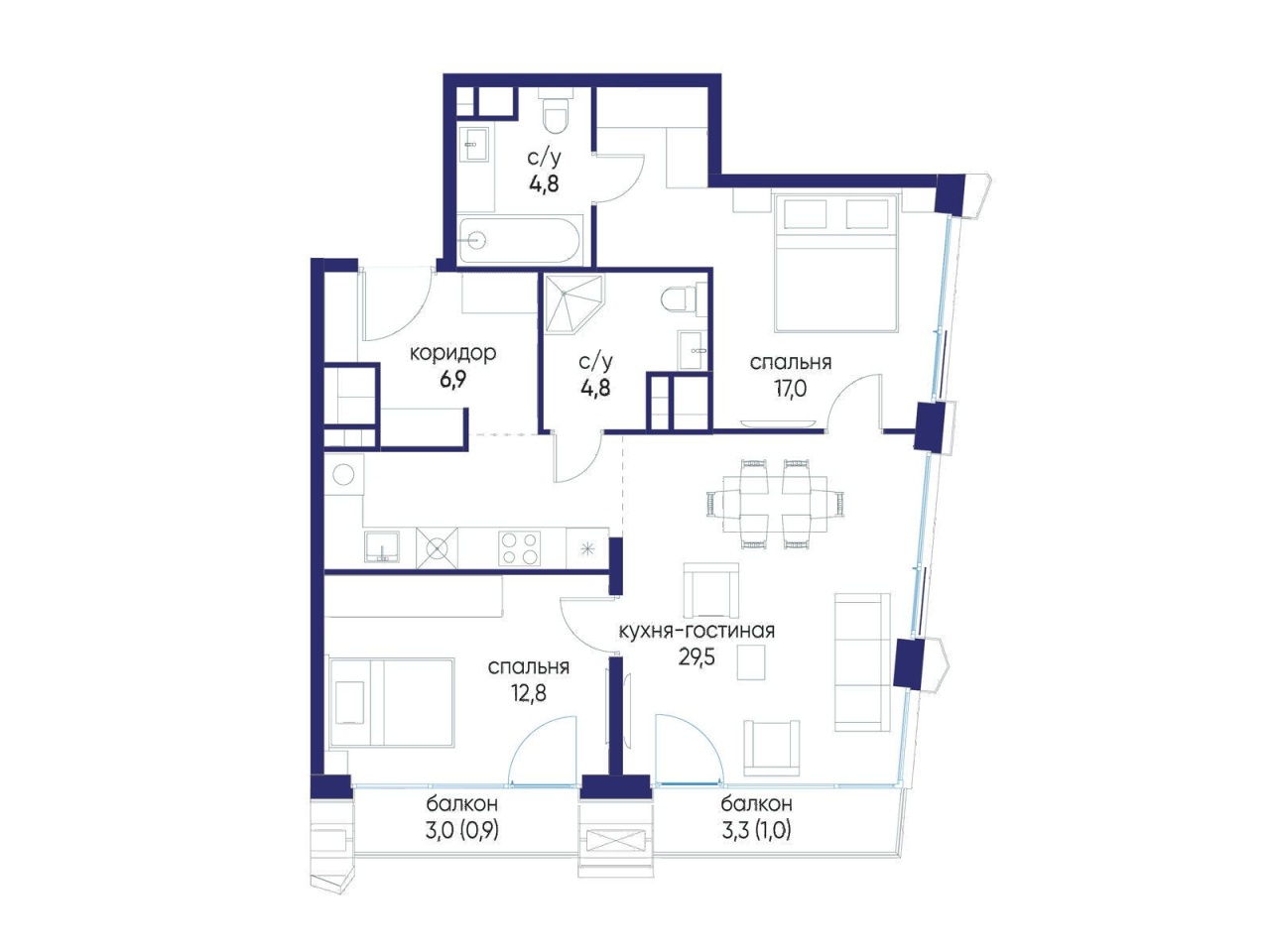 | Жилая площадь | 29.8 м2 | Площадь комнат | 17 + 12.8 м2 |