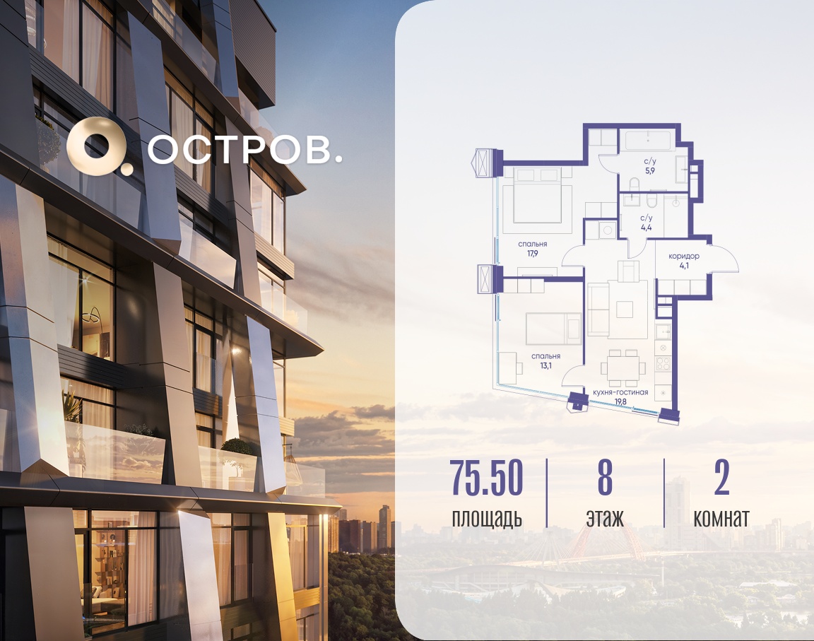 | Жилая площадь | 34.6 м2 | Площадь комнат | 17.4 + 17.2 м2 |