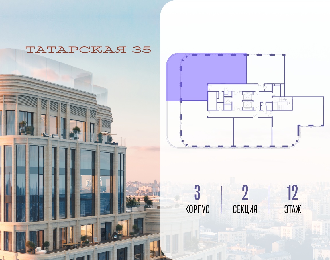 ТАТАРСКАЯ, 35 - новая архитектурная доминанта Замоскворечья, достопримечательность на фотопанорамах исторического центра Москвы. Элитный дом, созданный для тех, кто умеет смотреть далеко вперед, мыслить масштабно и воплощать собственный сценарий жизни.