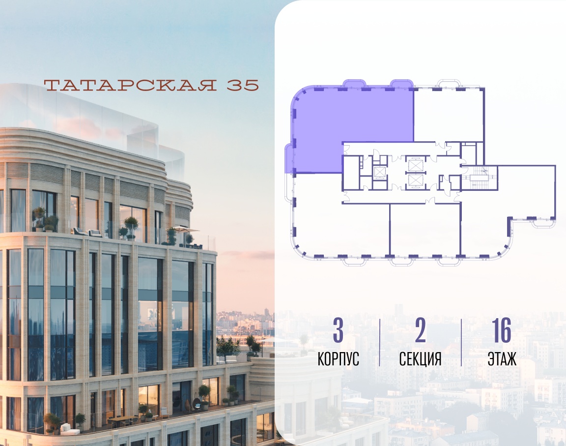 ТАТАРСКАЯ, 35 - новая архитектурная доминанта Замоскворечья, достопримечательность на фотопанорамах исторического центра Москвы. Элитный дом, созданный для тех, кто умеет смотреть далеко вперед, мыслить масштабно и воплощать собственный сценарий жизни.