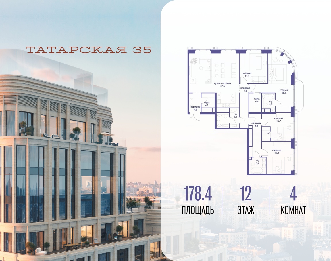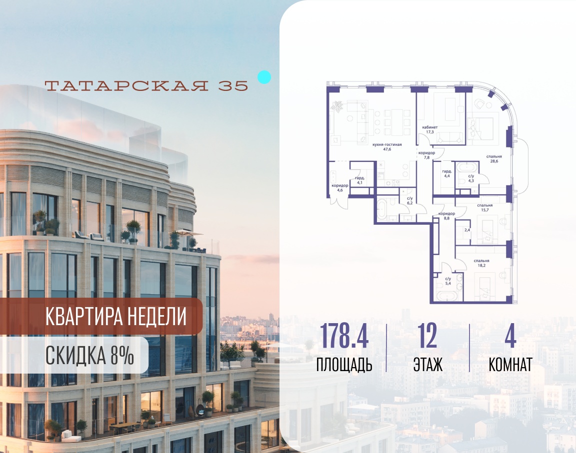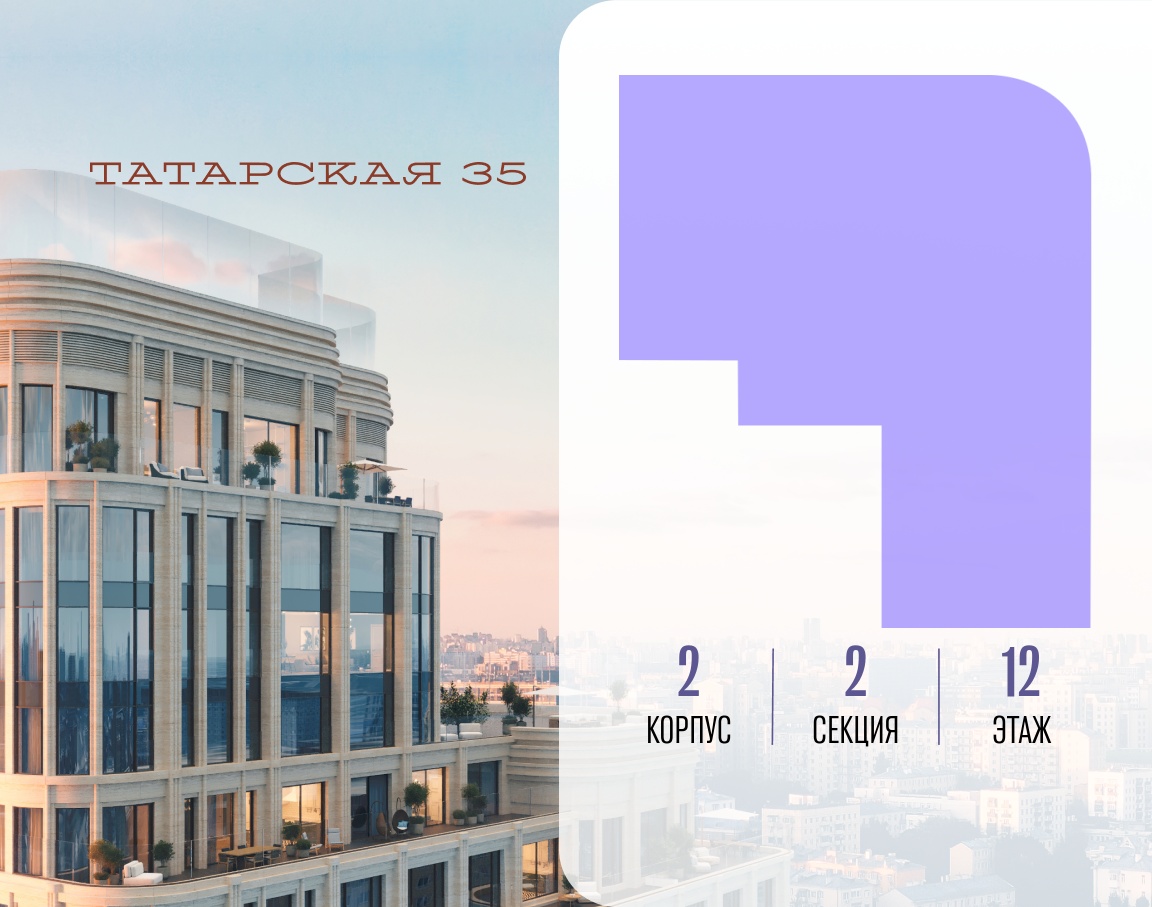 ТАТАРСКАЯ, 35 - новая архитектурная доминанта Замоскворечья, достопримечательность на фотопанорамах исторического центра Москвы. Элитный дом, созданный для тех, кто умеет смотреть далеко вперед, мыслить масштабно и воплощать собственный сценарий жизни.