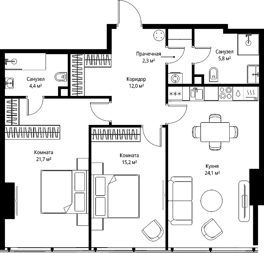 | Жилая площадь | 36.9 м2 | Площадь комнат | 21.7 + 15.2 м2 |
