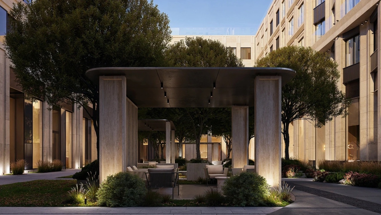 Закрытый внутренний двор благоустроен как тихое зелёное пространство: аллеи, взрослые деревья и приватные зоны для прогулок создают ощущение уюта прямо у дома.